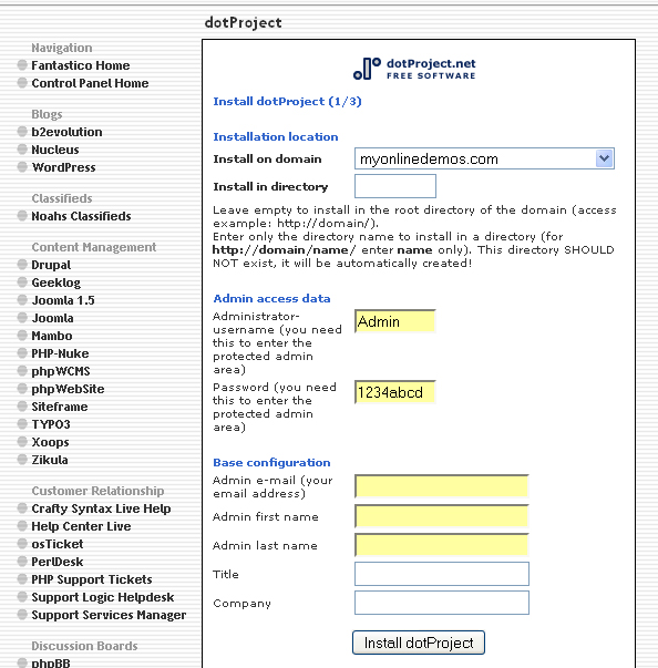 15. When you are done, click the Install dotProject button.
