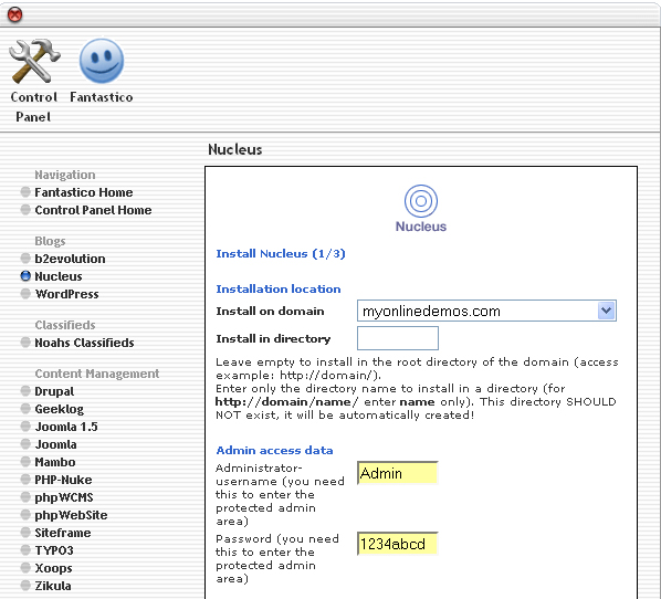 8. Enter a password in the Password text box. You need this to enter the Nucleus administration area.