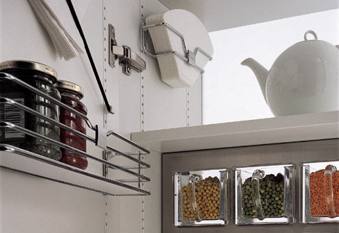 • Install hooks and racks on the insides of cupboard doors. On a tall larder door, you might hang aprons, pans, and brushes, and other fairly flat, unbreakable items. Shallow plastic or metal racks hold objects in place as the door opens, and so are ideal for more fragile items.