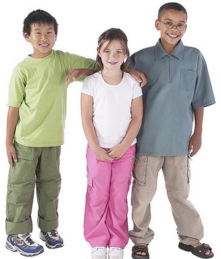It is outside the scope of this article to discuss clothing for children in detail, but some general principles apply: clothing should be roomy, with wide armholes and plenty of legroom, lightweight while suitable for the time of the year. Tight bands and belts are best avoided: garments that fasten in the front make it easier for a child to learn how to dress himself. Stretch fabrics are practical and comfortable. Buying new clothes one size too big is a false economy: when they are new they do not fit properly, and by the time they fit they are wearing out.